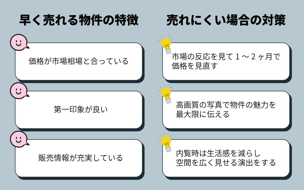 相場より高めの価格設定や立地条件の悪さがあると、売却まで半年〜1年かかることもあります。反対に、人気エリアや築浅物件などは1か月以内で成約するケースもあります。