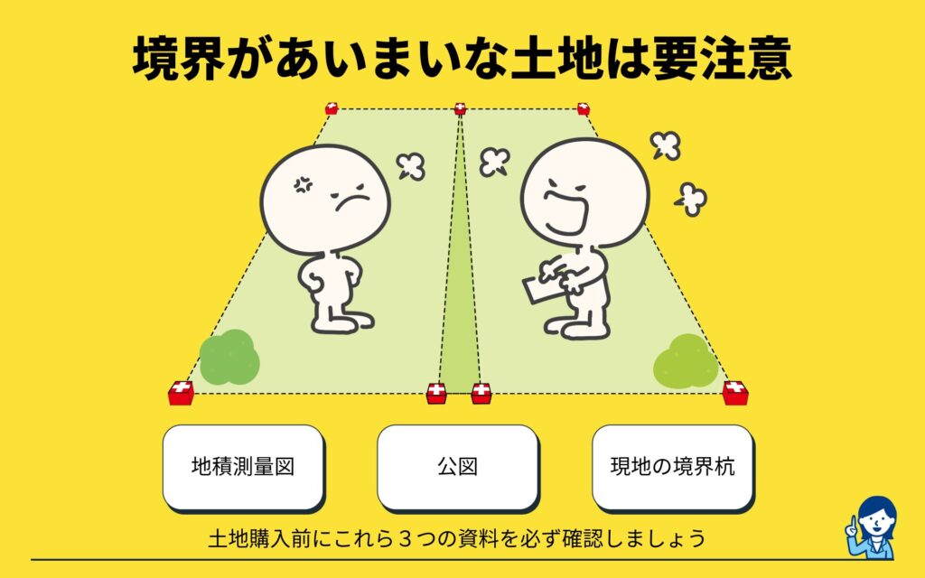 といったケースが多く、購入後に隣地との争いが発生することも珍しくありません。